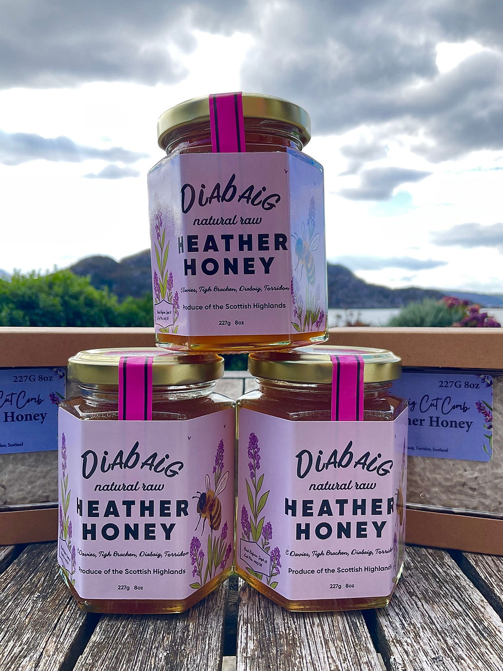 From our small apiary situated on our croft land in Diabaig, Tigh Brachen heather honey is gathered from the heather covered hills surrounding Loch Diabaig, Torridon